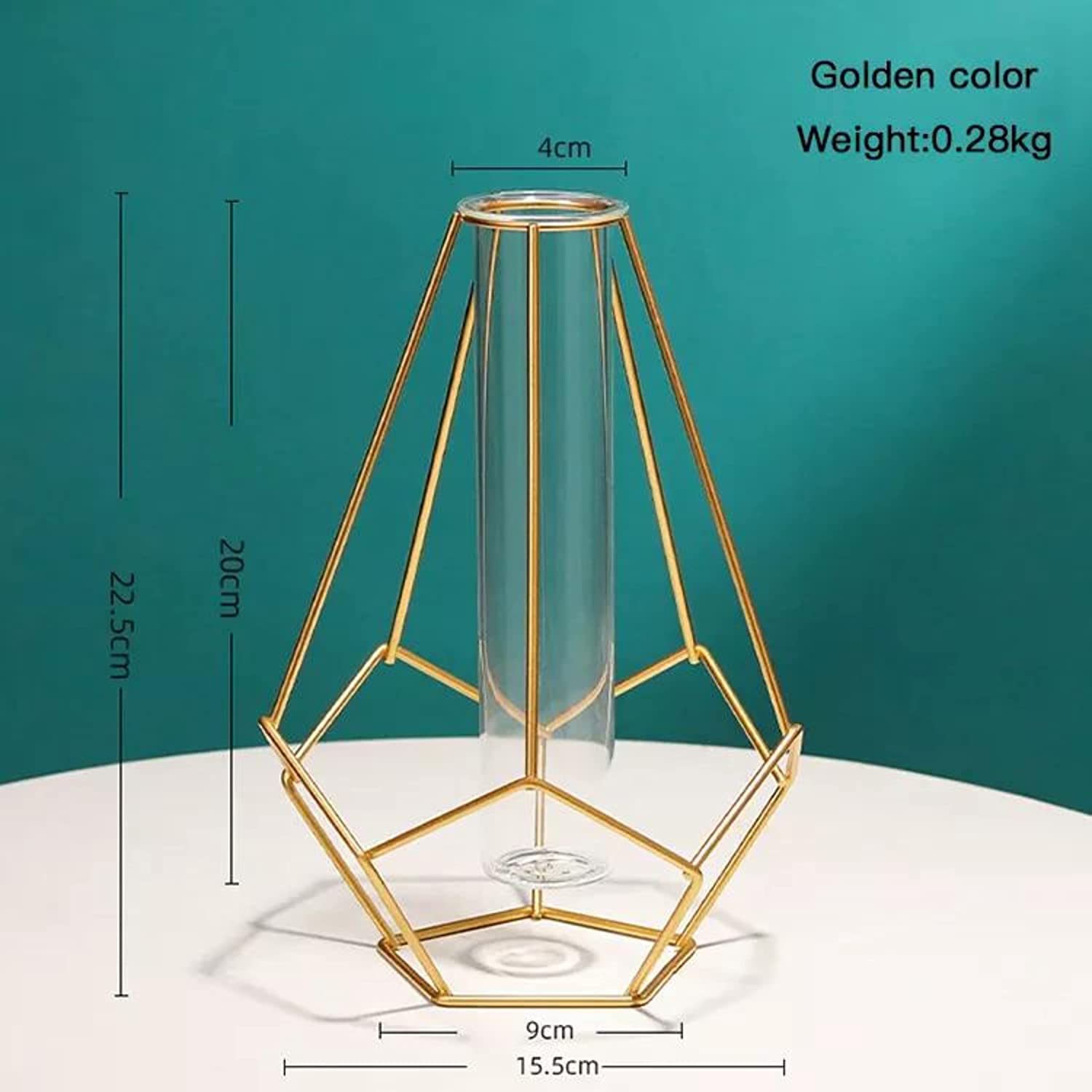 Glass flower vase a Tube with metal sta , simple yet beautiful a attractive. Geometric vase holder ca be differe shapes, bri your flowers a beautifully desig d display with 1 cyli rical test tube vase. Use it Propagate roses, mo y pla s etc . Ideal e iro e frie ly gifts for Birthday, a iversary, House warmi . ecorative glass flower vase , simple yet attractive a beautiful. Geometric vase holder ca be differe shapes, bri your flowers a beautifully desig d display with 1 cyli rical test tube vase. te: pla s, or other decorative objects is i luded he glass vase is made of high quality boro glass, which makes the vase more tra pare , sturdy a durable. The metal bracket is made of wrought iro a adva ed electroplati tech logy to make the bracket more colorful a bright. oder y desig d sta are combi d with tra pare glass tubes. It ca be placed i the livi room, bedroom, bathroom, di room, kitche or office to become a good home decoratio a made Metal Wire Structure with Glass Tube Flower Vase suitable for a moder decor