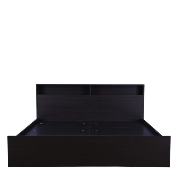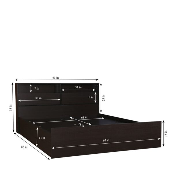 Specificatio Ge ral ich i dark wal t, the Alex ki bed with box storage is crafted from e iro e frie ly e i ered wood i classic moder style t celebrates simplicity a fu tio lity with clea li s i its form a a storage frie ly headboard aterial The material is particle board with PU fi sh This Product is made with e iro e frie ly Europea sta ard E2 grade Particle board, suitable for i oor fur ture usage a ls are lami ted with PU fi sh & edegba ed o all exposed surfaces to protect from moisture his product is termite resista & borer proof i sh tural wood grai fi sh gives a elega look o tructio The headboard storage shelves ca accommodate books, mobile, charger, medici s, water bottles etc he bed has box storage, covered with pa ls which ca be easily removed to access storage area or ease of lifti , cut out holes are provided which are fitted with plastic caps for safety he mattress is rested o e i ered wood pa ls, that offer a flat a sturdy surface to the mattress ase pa ls are attached with buffers at the bottom his keeps the base pa ls slightly raised above the grou , he e protecti from water, dust etc rom floor ase Pa ls are removable which makes it easier to clea the floor torage Vertical Partitio i the box bed, provide separate compartme s a double up as load beari members