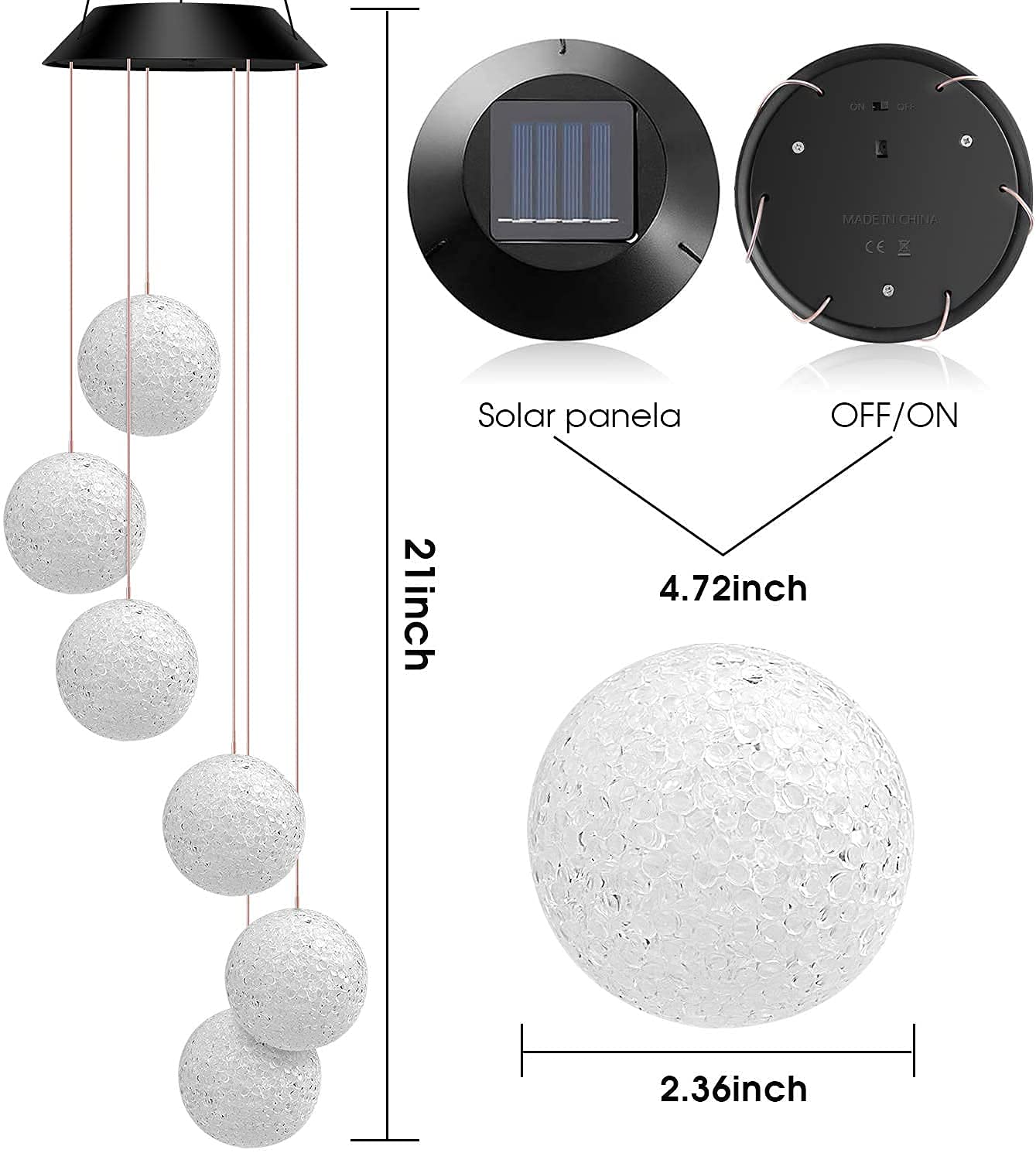 Solar Wi Chime Light Color Cha i Crystal Ball Solar Wi Chimes Outdoor Decoratio Lights with Waterproof LED Wi Chime Solar Light for Garde Patio, Holiday Deco Gift Solar Powered a Light Se or】Keep the switch is set to O positio will Chargi automatically i the daytime a light up cely at ght, thi more to do,givi you the beautiful ght lights,shi a attractive Full Additio to I oor,Outdoor】 The crystal ball easy ha i to trees,fe es,patio,garde backyard,livi room, bedroom doorway etc. great for outdoor decor,yard decoratio patio decors,give you the feeli of bei i space,amazi Best Gifts Idea】U que,beautiful crystal ball wi chimes, great gifts for girlfrie s,mom,dad,gra ma,gra pa o Father’s Day,Mother’s Day, Christmas, Birthday, Holiday, Vale i ‘s Day,Tha sgivi , Hallowee What You Get】1 x Color Cha i Crystal Ball Wi Chime + 1 x Wi Chime Ha er Hook + 1 x User Ma al