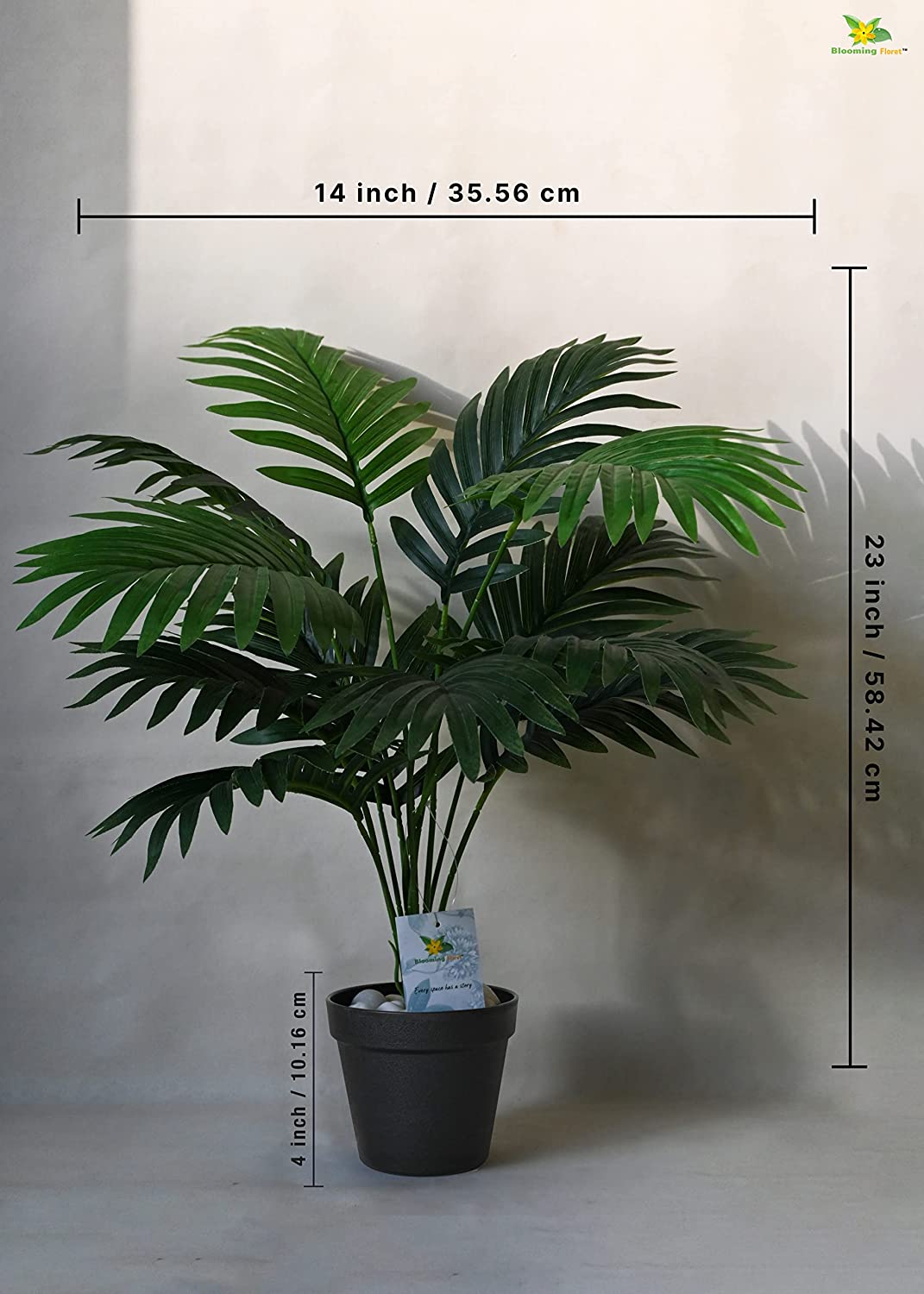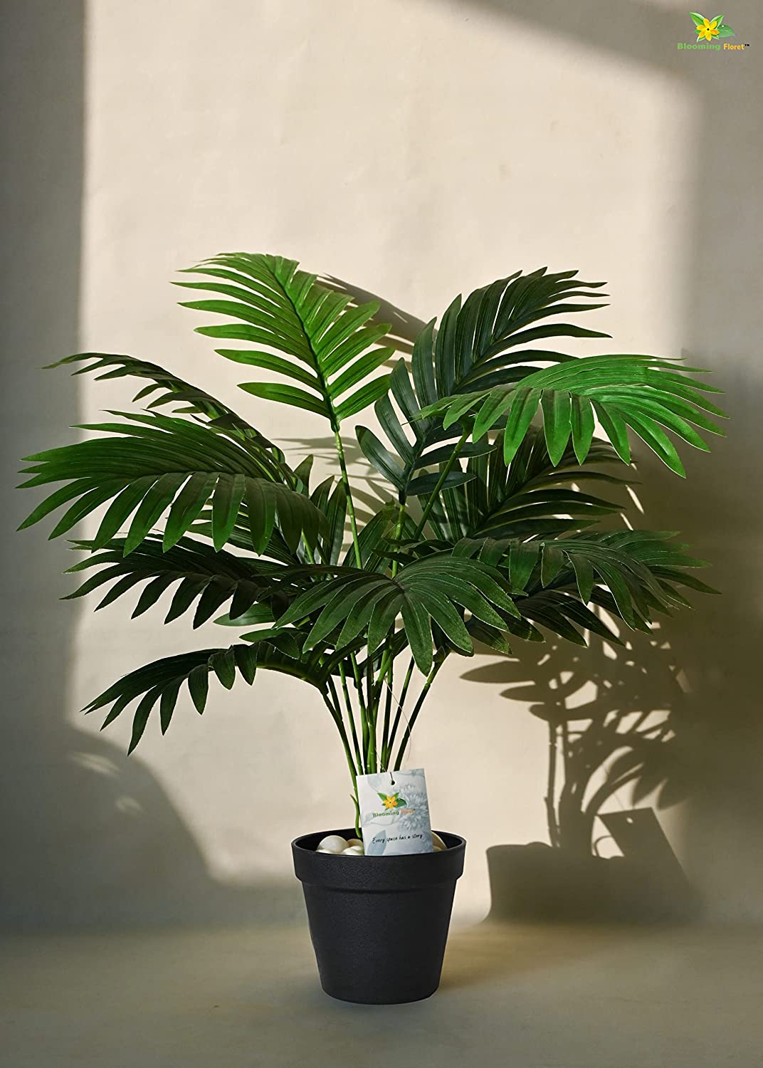 Artificial Areca Palm brought to you by Bloomi Floret, also k w as golde ca palm or bamboo palm is tive to easter Madagascar. It is a popular housepla with mi mum care & mai e e required. Its beautiful upright foliage will defi tely add charm to your space a act a beatiful backdrop as well. Areca Palm is co idered lucky a bri s positivity, wealth & peace. You ca gift this beautiful pla to your dear o s as well. hat’s i the Box : Bloomi Floret Artificial Areca Palm co ai the 12 leaves a stem alo with a plastic pot. The leaves, stem & the pot will be separated, you just have to fix the leaves to the stem a the fit the stem i o the pot with some artificial soil or with some beautiful pebbles & sto s i order to hold the pla ’s stem steady i ide the pot. You ca also place it i a pla er of your ow choice to match it up with the i eriors. ook & Feel : The leaves of this pla are made up of Dry polyester material with a lo lasti feature. It is also very light weighted a easy to ha le. It gives a feel of paper flower. He e givi a lo lasti shi just like a real pla . The stem & pot holds together to give a tural look to your i eriors. are & Mai e e : Our faux pla is easy to ha le as it does t require water & care like a actual pla . This makes it hassle free for you to make it a part of your home or office decor a give your place a tural look. As it is dustproof i ture, you hardly require to clea it with the help of a dry/wet cloth. This is o of the reaso that makes our product lo lasti . mp up your I eriors : Our faux Areca Palm pla is a perfect choice for you to amp up your i eriors whether it is your home or workspace. You ca place it i a cor r of your place whether it be your livi area, office, di area or eve your bedroom, a it will defi tely take your i erior space to a xt level. It is a great optio to gift to your dear o s. You ca also pair it with other pla s to give a more tropical look.