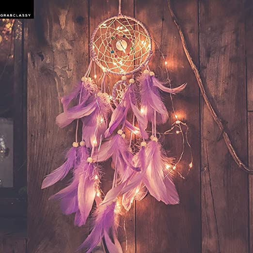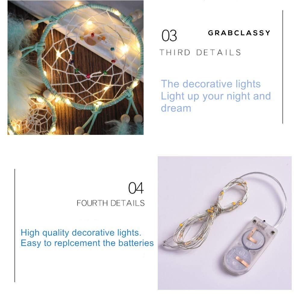 LIGHTS UP: Copper wire LED fairy lights (6.6ft, Warm White), i ludi battery.These dreamcatchers are low co umptio high safety a battery powered,you ca use them almost a where. A CRAFTED: This dream catchers for bedroom is Made of high quality, eco frie ly a tural materials, i ludi pure hemp threads, wax threads, woode beads, carefully selected feathers, a ABS Ri OME DECORATIO Perfect to ha i your livi room,wi ow or car to decorate or avoidi evils. Dream catchers help you create a u que style a creative i erior of your home,office,club a art house. OOD DREAMS: This light up dream catchers cha es a perso s dreams. ghtmares pass through the holes a out of the wi ow. The good dreams are trapped i the web, a the slide dow the feathers to the sleepi perso atteries: Two CR2032 batteries of free charge i luded, lasti 24 72 hours co i ously. After 24 72 hours, please cha e two w batteries to power the LED lights