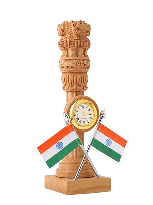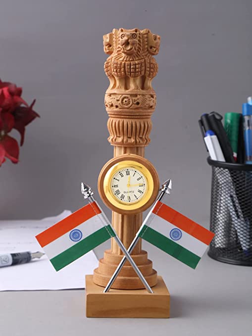 Be the first to review “RDK Antique Designed Wooden Carved Ashok Stambh Pillar with 2 Flags & Clock II Indian National Emblem Table Showpiece Figurine for Home and Office II Receptions/Desk II Gifting I Desk Organizer”